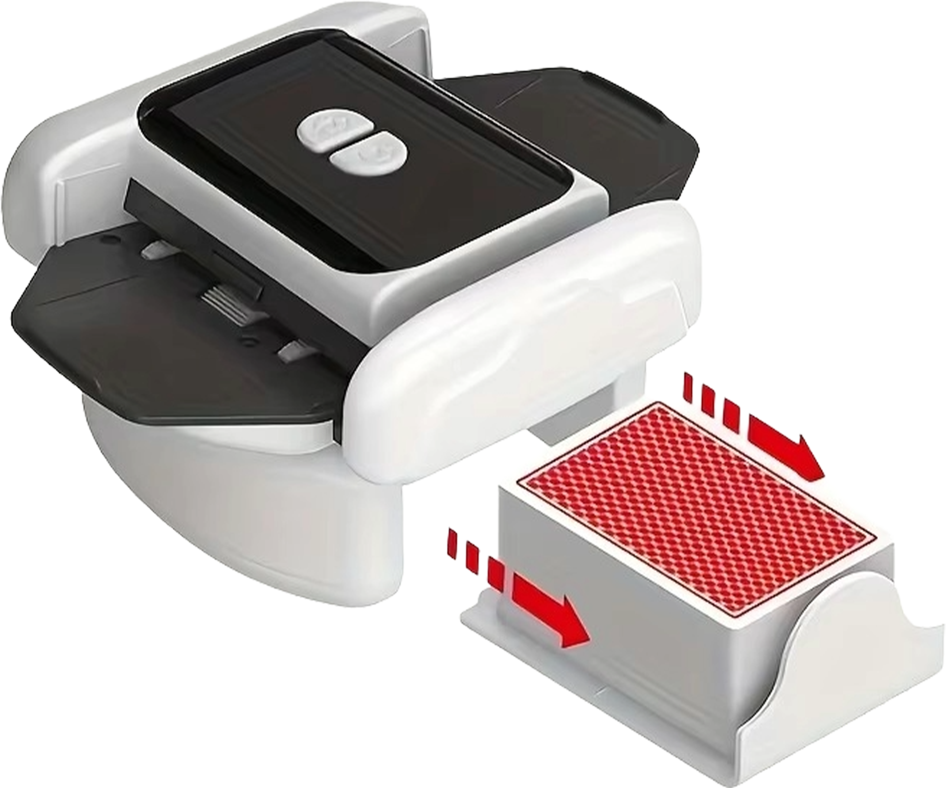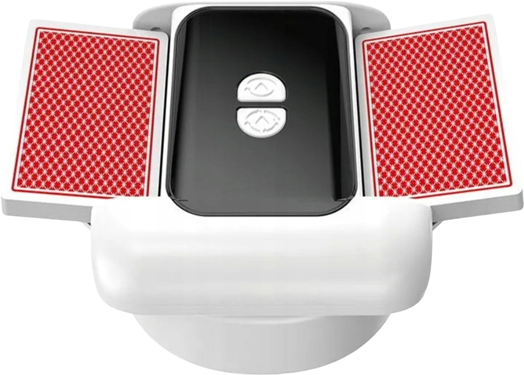 Kupując u nas, otrzymujesz kompletny zestaw gotowy do gry: automatyczną tasowarkę na 2 talie, wysuwaną tacę na potasowane karty, kabel ładujący USB-C oraz instrukcję obsługi.