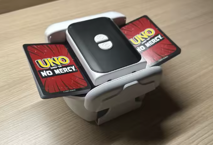 Urządzenie ma dwa proste tryby pracy. Możesz przytrzymać górny przycisk i tasować karty tak długo, jak go wciskasz, albo użyć dolnego przycisku: kliknij raz, aby maszyna tasowała automatycznie, i kliknij ponownie, aby ją zatrzymać.